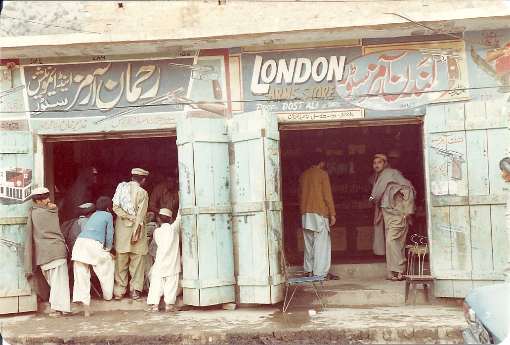 This is a photo of the London Gun Store in Darra (close to Peshawar in Pakistan and the Afghan border) taken in 1981. Wikipedia describes Darra as a town entirely devoted to the gun trade. It has a main street with alleys and side streets containing workshops where working copies of the world’s guns are made including Kalashnikovs and pen-guns. This is exactly as I remember the town but travel by foreign visitors to Darra is no longer permitted due to the obvious security concerns. However, there is aYou Tube video posted by an American who made a visit: The gun markets of Pakistan