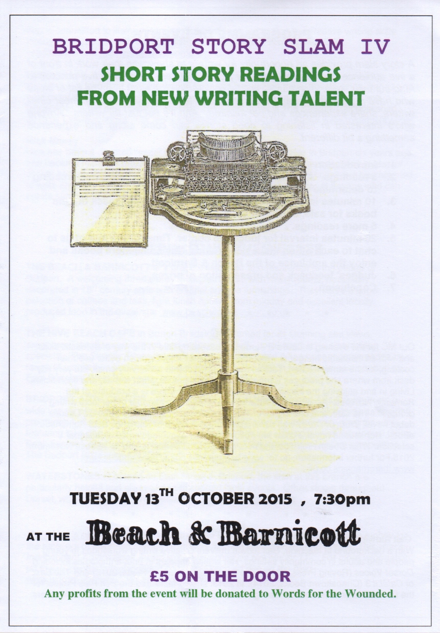 Organised by Frances Colville, the fourth Bridport story slam was another wonderful event. I was honoured to act as a judge alongside novelist Rosanna Ley and Nick Macy, manager of Waterstones, Bridport. Author Laura James was an excellent MC at the event.