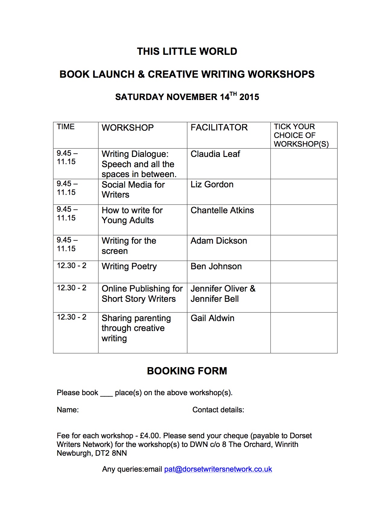 Please find details of a writers’ day in Dorchester with flyer and booking form below: