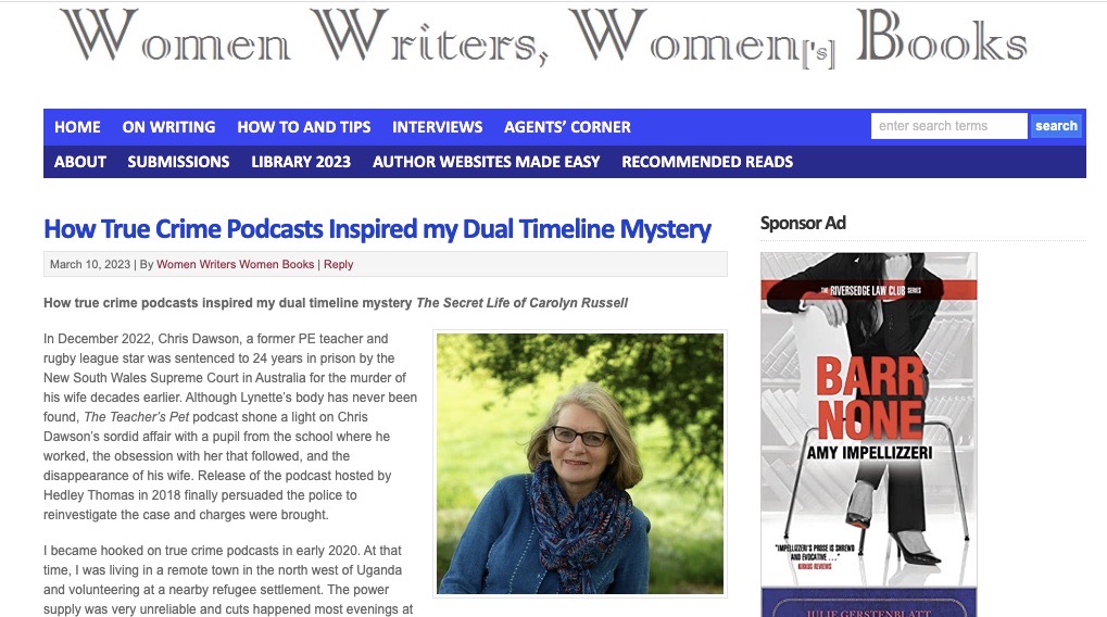 In other news, I wrote a piece about the inspiration that led me to write The Secret Life of Carolyn Russell which appears on Women Writers, Women’s Books. Find out here how I spent time in Uganda listening to true crime podcasts and the ways in which they influenced my writing. The Secret Life of Carolyn Russell, a psychological mystery, will be released by Bloodhound Books in July 2023.