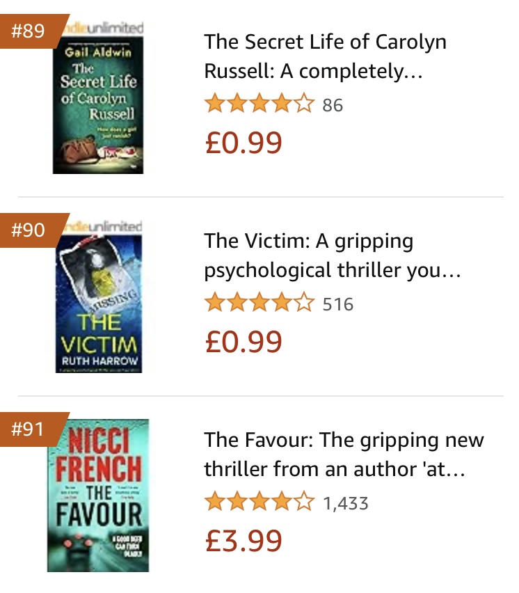 While ⭐ reviews can cause much ire, are they actually bad for a book’s performance? I don’t think so. They may induce sympathy purchases or prick the curiosity of readers to see which side of the fence they fall on. Either way, bring on your reviews – good, bad or ugly. And, if you haven’t purchased your copy yet, The Secret Life of Carolyn Russell is part of a September kindle promotion where all these suspenseful titles are available for 99p until the end of the month.
