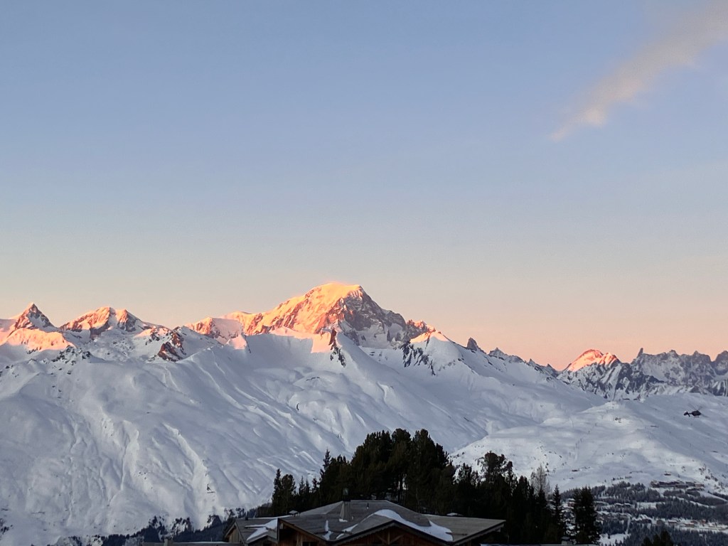 David and I spent a superb week in the French Alps where I learnt to ski. He’d been skiing in his twenties, but I’d never thought it would be something I might enjoy. How wrong could I be? There was so much to like about the experience starting with the joy of being surrounded by snow-covered mountains when the sun shone and the sky was blue. The setting was very uplifting and the weather remained consistently good throughout the week. We stayed half board in a hotel with a view of Mont Blanc and enjoyed excellent buffet meals in the restaurant.