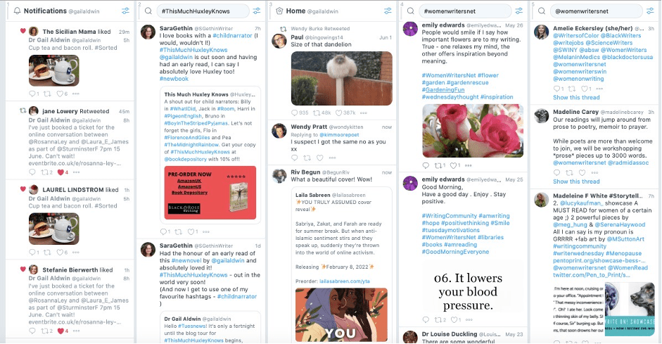 If you’d like to start using Tweetdeck, Twitter provides two excellent step-by-step guides covering both the basic (here) and advanced features (here). YouTube is also a great source for user generated how-to videos about using Tweetdeck, such as here or here. (Thank you to Women Writers’ Network for the links.)