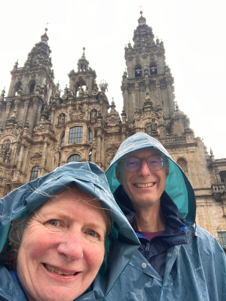 Although the walk from Padrón to Santiago is only 25km we eked this out over two days. During the final stretch, we waded streams with no hope of keeping our boots dry and finally picked up a couple of ponchos. Evidence of our flattering attire can be seen in this photo which was taken upon reaching the cathedral in Santiago.